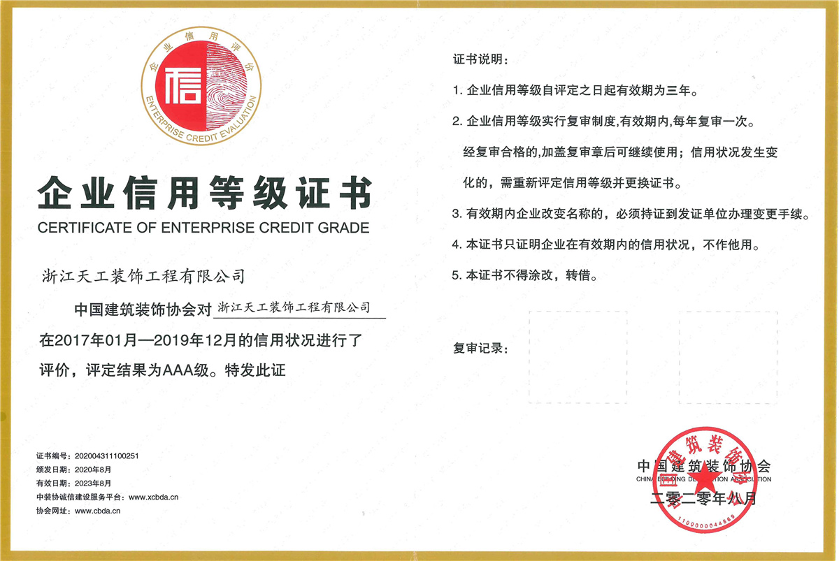 浙江天工裝飾工程有限公司成立于1994年,是一家專注于建筑行業(yè)近三十年,余杭區(qū)內(nèi)規(guī)模最大、最專業(yè)的現(xiàn)代化專業(yè)承包企業(yè),連續(xù)十二年榮獲“余杭區(qū)建筑業(yè)十強(qiáng)企業(yè)”稱號。公司現(xiàn)任余杭區(qū)建筑裝飾行業(yè)協(xié)會會長單位、杭州市建筑裝飾行業(yè)協(xié)會副會長單位、浙江省建筑裝飾行業(yè)協(xié)會副會長單位、中國建筑裝飾協(xié)會理事單位。公司具備建筑裝修裝飾工程專業(yè)承包壹級、建筑幕墻工程專業(yè)承包壹級、建筑裝飾工程設(shè)計專項(xiàng)甲級、建筑幕墻工程設(shè)計專項(xiàng)甲級、展覽陳列工程設(shè)計施工一體化貳級、電子與智能化工程專業(yè)承包貳級、消防設(shè)施工程專業(yè)承包貳級、防水防腐保溫工程專業(yè)承包貳級,集建筑工程施工總承包、建筑機(jī)電安裝、城市及道路照明、鋼結(jié)構(gòu)、結(jié)構(gòu)補(bǔ)強(qiáng)、安防施工等多項(xiàng)資質(zhì)。主要從事大型公共建筑、星級酒店的室內(nèi)精裝修、建筑幕墻及建筑智能化工程的設(shè)計與施工。 天工裝飾始終把建筑裝飾當(dāng)作一項(xiàng) “美的事業(yè)”,在施工中嚴(yán)把質(zhì)量關(guān),不斷規(guī)范和提升工程技術(shù)標(biāo)準(zhǔn)。近年來,公司承建的浙商開元名都國際酒店I標(biāo)段裝飾工程、杭州藝尚雷迪森廣場酒店裝修工程、余杭區(qū)時代廣場5號樓(市民之家)室內(nèi)裝飾工程、永安之星室內(nèi)裝飾工程、青山湖科技城創(chuàng)業(yè)廣場裝修工程、杭州未來科技城醫(yī)院室內(nèi)裝飾工程、杭州師范大學(xué)附屬實(shí)驗(yàn)學(xué)校裝修工程、杭州老板電器股份有限公司辦公樓裝飾工程、深川控股集團(tuán)綜合樓幕墻工程、浙江省科技信息研究院幕墻工程、北航杭州創(chuàng)新研究院(余杭)內(nèi)裝及智能化提升改造項(xiàng)目(研究生院)工程、臨平新城人才服務(wù)中心設(shè)計釆購施工(EPC)工程總承包項(xiàng)目、浙江大學(xué)先進(jìn)電氣裝備創(chuàng)新中心室內(nèi)外裝飾及改造項(xiàng)目設(shè)計采購施工(EPC)工程總承包項(xiàng)目等,先后獲得“中國建筑工程裝飾獎”、“全國建筑裝飾科技創(chuàng)新獎”、浙江省建設(shè)工程“錢江杯”優(yōu)質(zhì)工程獎、杭州市建設(shè)工程“西湖杯”優(yōu)質(zhì)工程獎、嘉興市建設(shè)工程“南湖杯”優(yōu)質(zhì)工程獎、“浙江省優(yōu)秀建筑裝飾工程獎”、“浙江省優(yōu)質(zhì)安裝質(zhì)量獎”等榮譽(yù)。 天工裝飾恪守“誠實(shí)守信、文明經(jīng)營”,近年來公司得到了客戶的信賴也獲得了業(yè)界的好評,先后被評為“國家級守合同重信用單位”、“全國建筑裝飾行業(yè)AAA級信用企業(yè)”、“全國百家科技創(chuàng)新型企業(yè)”、“浙江省AAA級守合同重信用單位”、“人民銀行信用等級AAA級企業(yè)”、“浙江省信用管理示范企業(yè)”、“浙江省誠信企業(yè)”、“浙江省建筑裝飾行業(yè)強(qiáng)優(yōu)企業(yè)”、“杭州市建筑業(yè)優(yōu)秀企業(yè)”、“余杭區(qū)建筑業(yè)十強(qiáng)企業(yè)”、 “余杭區(qū)人民政府質(zhì)量獎”等榮譽(yù)。
